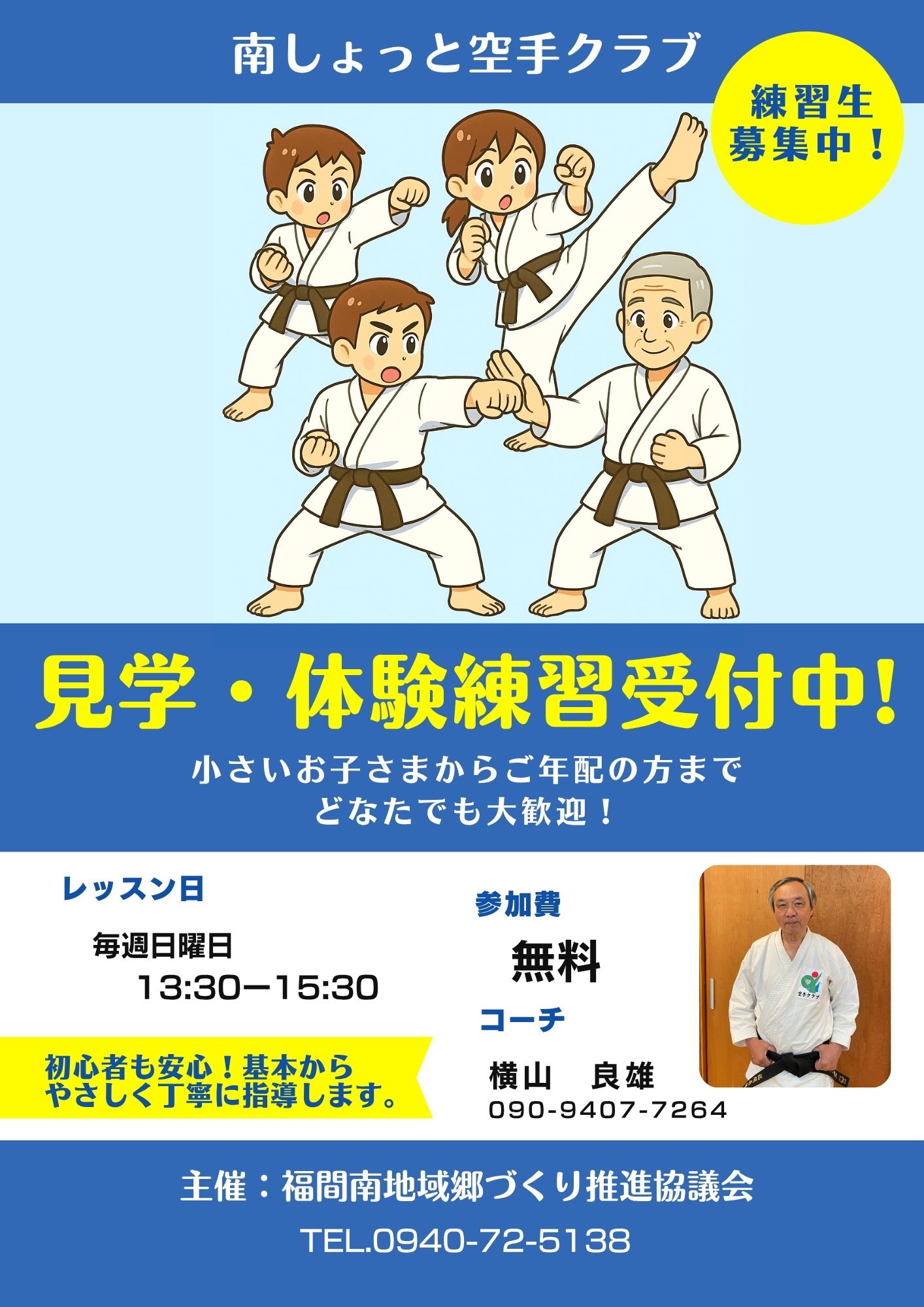 日曜日の午後、体を動かしてリフレッシュしませんか。 南しょっと空手クラブでは、現在 練習生を大募集しています。