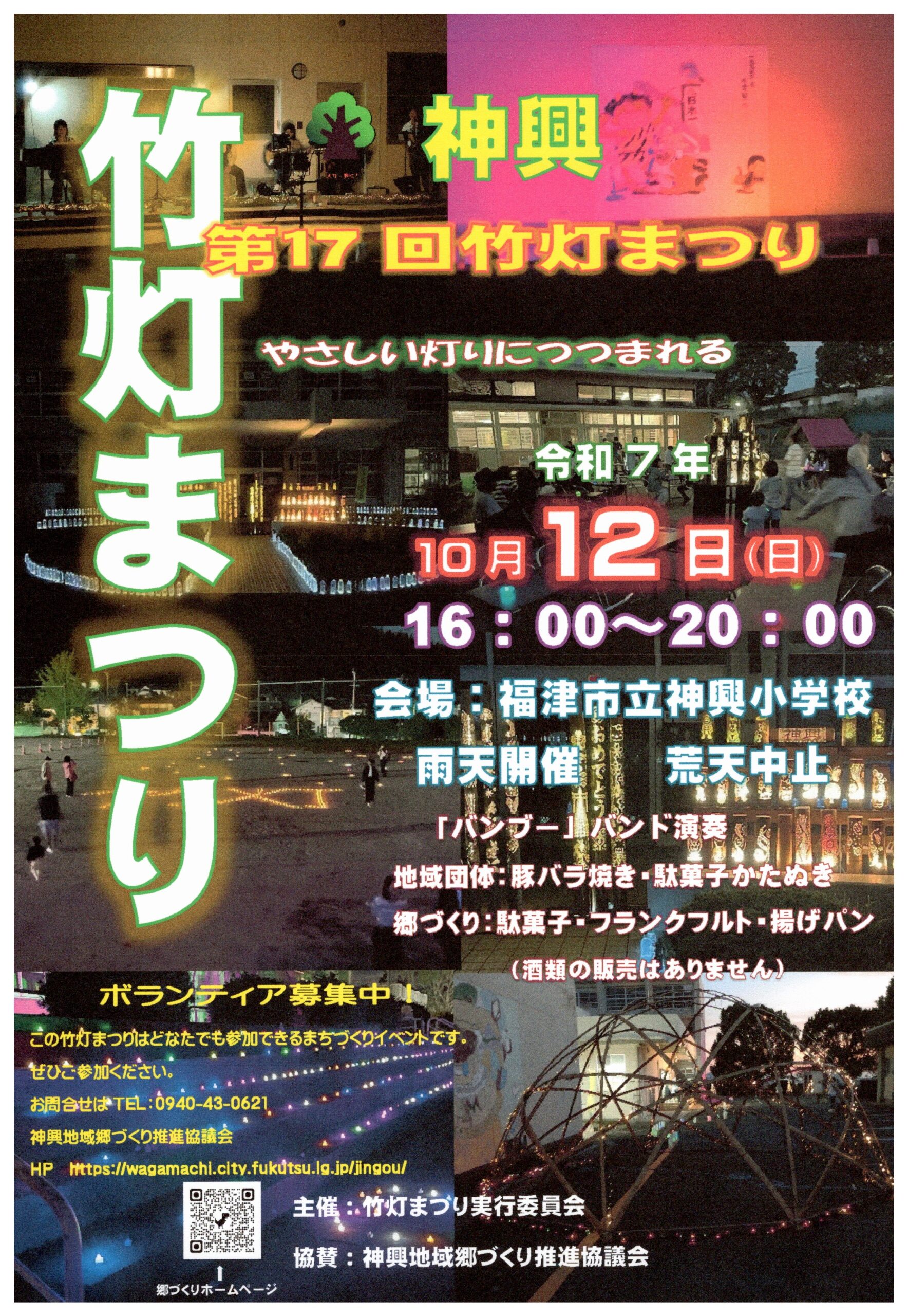 第17回竹灯まつりを開催します。日時:10月12日(日) 16:00~20:00 場所:福津市立神興小学校 雨天開催 荒天中止