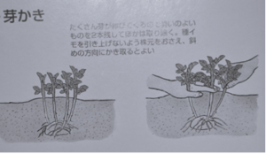 じゃが芋を大きく育てるために、芽欠きの作業が必要です。