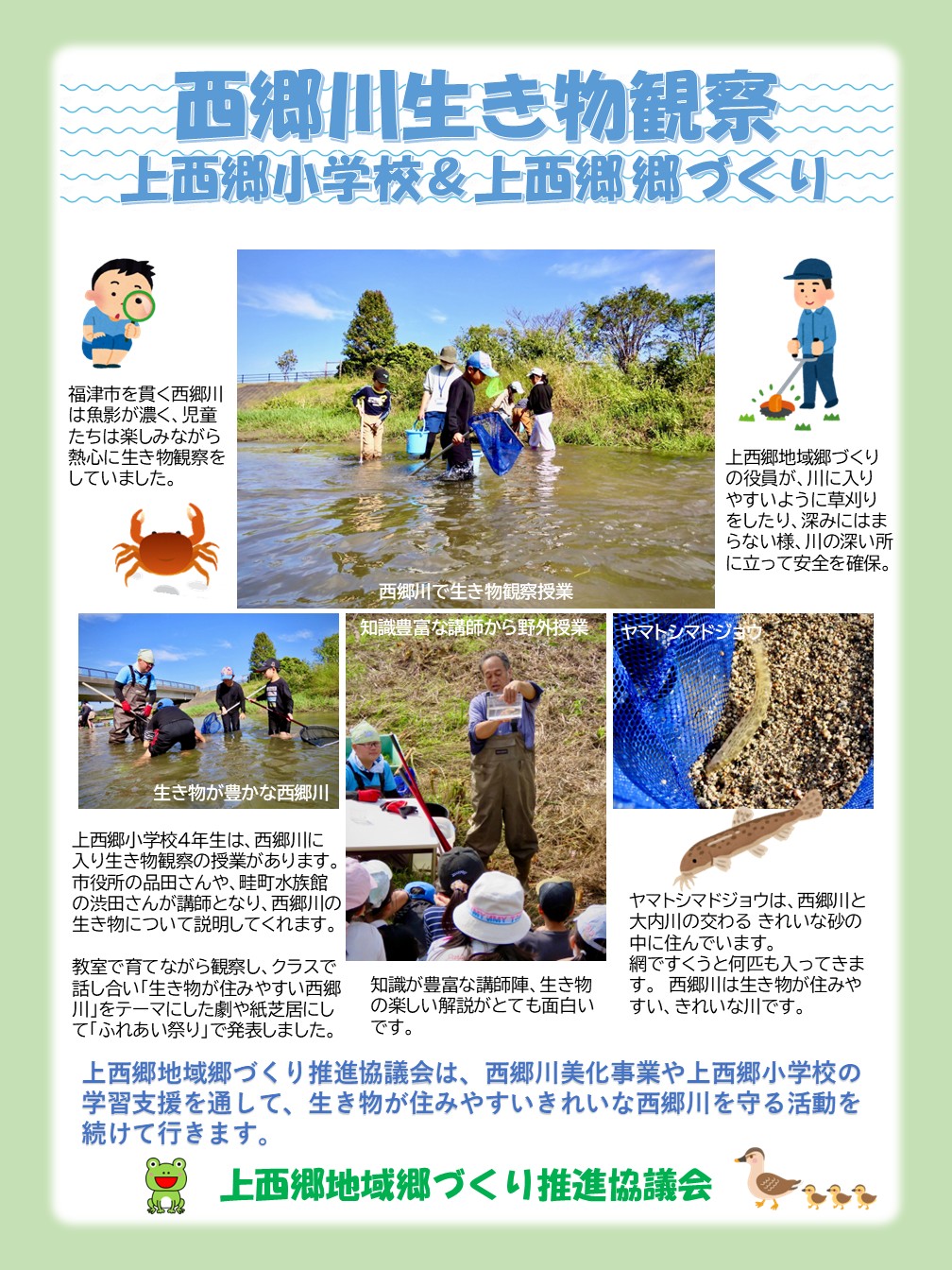 第20回環境フォーラム in ふくつ に、上西郷地域郷づくり推進協議会の「西郷川美化事業」&「上西郷小学校の西郷川生き物学習支援」の様子をパネル展示しました。