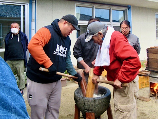 上西郷小学校の児童を招待して、餅つき大会がにぎやかに開催されました。