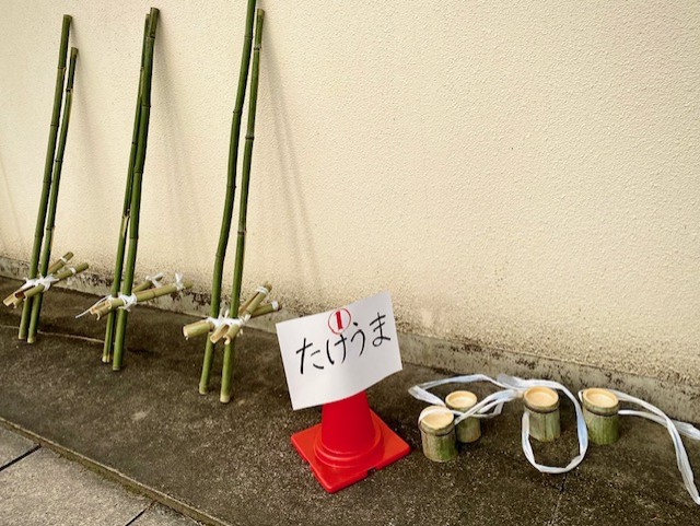 郷づくり本部役員が竹を切り出し、昔遊びで使う、竹馬とぽっくりを用意しました。