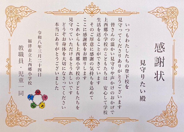 嬉しい感謝状です、見守り隊はじめ地域のみなさん ありがとうございます。