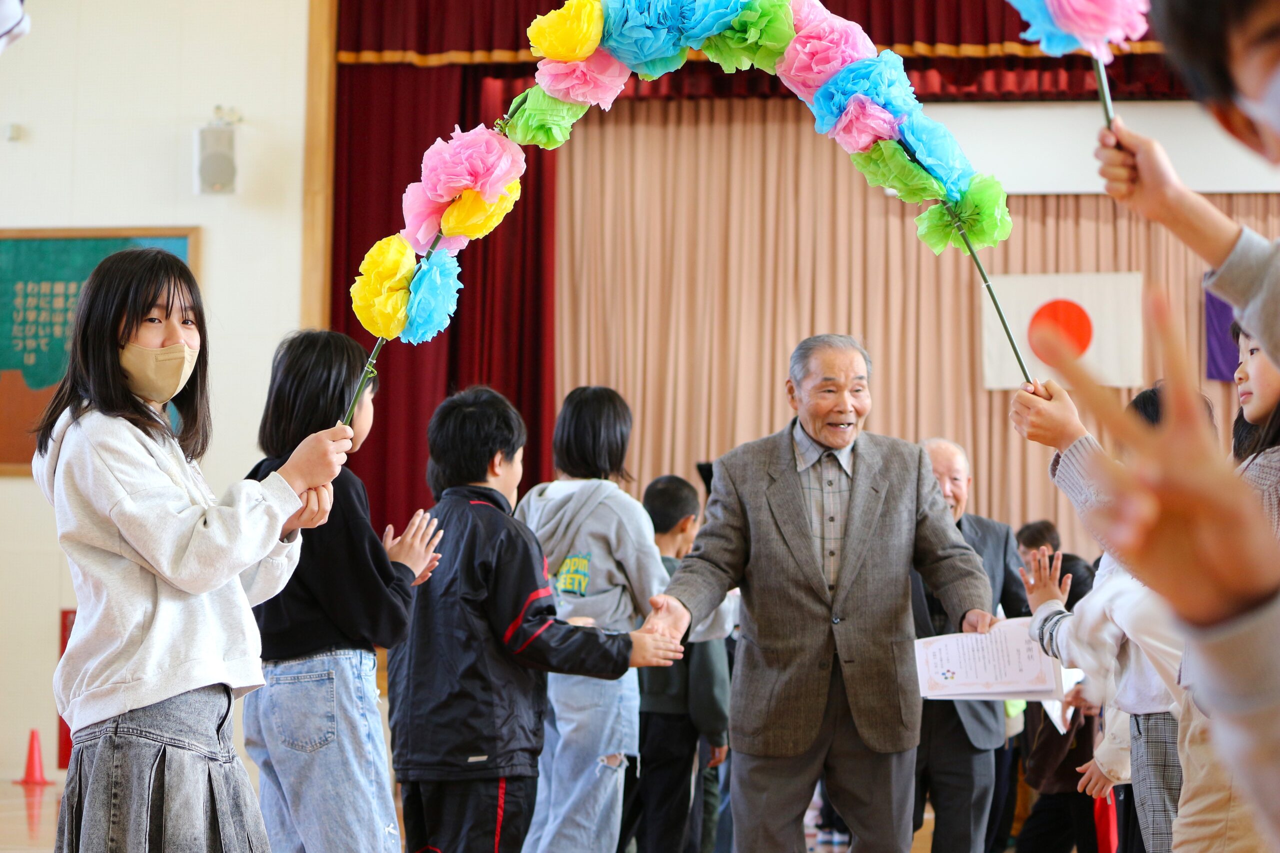 上西郷小学校では修了式の後、いつも児童の通学を見守ってくれる地域の方々へ「感謝の会」がありました。