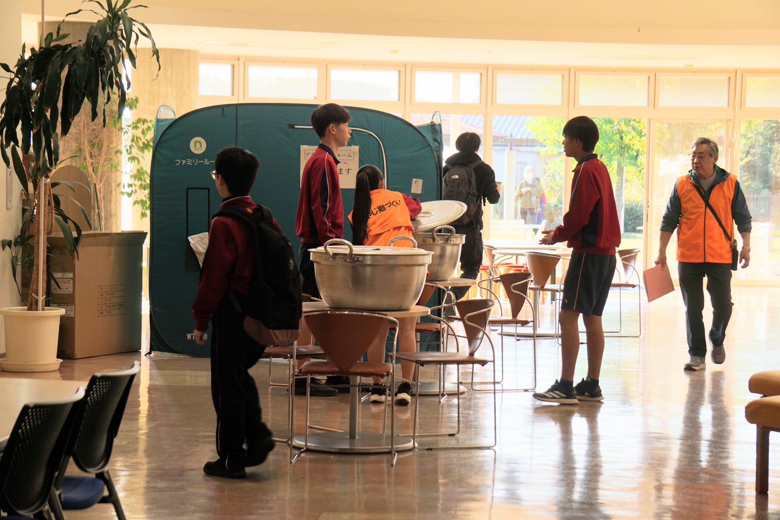 例年、津屋崎中学校生徒と合同訓練を行っていますが、今年度は一緒に避難所を設営するところから。中学生との合同会議を通して子どもたちの意見も踏まえ、工夫をして実施しています。