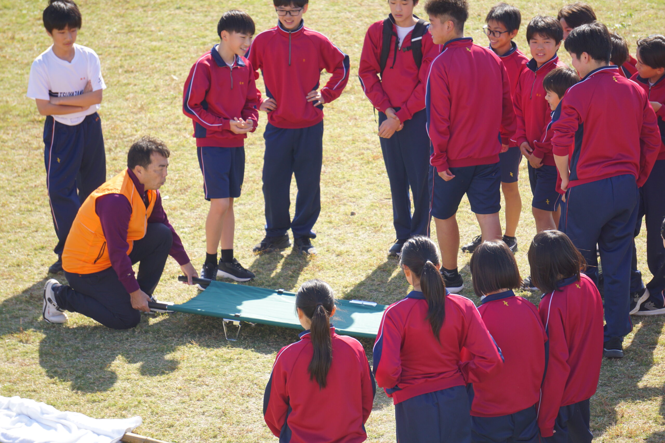 後から合流する、宮司地区の中学1・2年生は、中での模擬避難所、外での応急担架訓練や垂直避難訓練を実施。